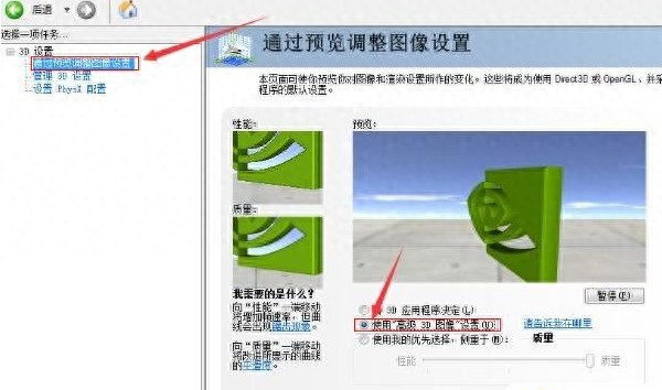 方法二:用鼠标在桌面空白处右键单击,并在弹出菜单中,点击“NVIDIA控制面板”项目,在弹出的新窗口中,点击“通过预览调整图像设置”,然后选择“使用高级3D图像设置”这个选项,修改完成后点击“应用”。