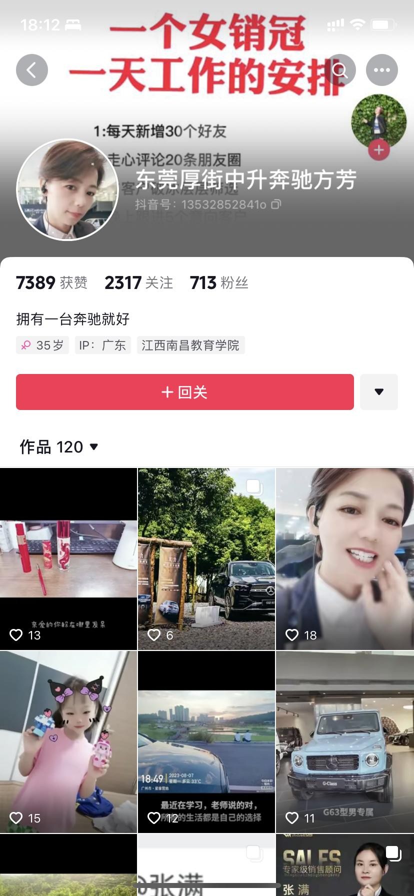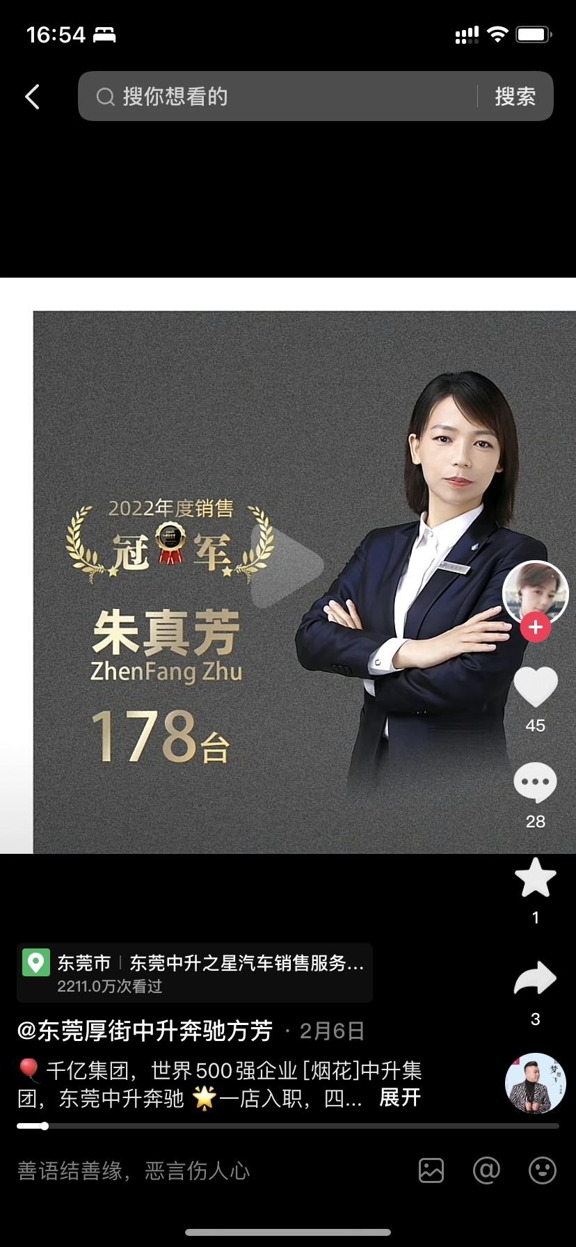 2023年2月6日,朱真芳发布了一条抖音,她穿着一身黑色西服,图片显示她是东莞厚街中升奔驰店的2022年度销售冠军,一年卖出了178台奔驰,这个业绩应该相当不错。