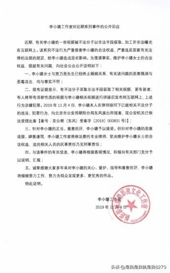 11月14日,李小璐工作室发声回应视频事件,声明中表示那些视频是被不法分子获取、加工并非法曝光,侵害李小璐的合法权益,已向派出所报案。并且公开表示自己已经和贾乃亮离婚。