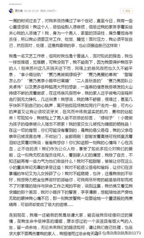 2018年1月6日,时隔一周,贾乃亮再次发长文回应了这段时间自己所经历的以及心路历程,表示自己被贴上了自己最不愿意贴上的标签“绿帽子”,家里的长辈全部病倒,自己很是自责,恳请大家不要再打扰,让他们自己处理这件事情。