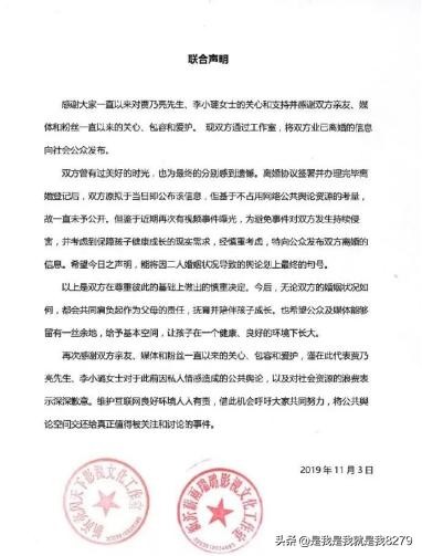 当晚22:00贾乃亮工作室和李小璐工作室发出联合声明,声明中表示,两人已经离婚,并且将共同抚养孩子甜馨。并且声称没有离婚当日宣布是为了不占用网络公共舆论资源。至此,两人的婚姻走向终点,唯一使两人连接起来的只有共同的孩子,不知道孩子长大后看到互联网上自己爸爸妈妈的消息会作何感想。