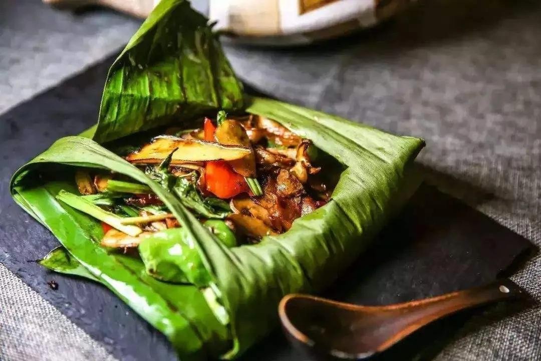 傣味包烧:包烧,是西双版纳傣族特殊的一种烹饪食品的方法。用这种方法加工食品不用锅具,以天然绿叶芭蕉叶或木冬叶(竹芋科植物)为烹饪工具,将欲烹饪的食物用鲜叶包裹,以火塘的炭火为热源,将食品烧熟。