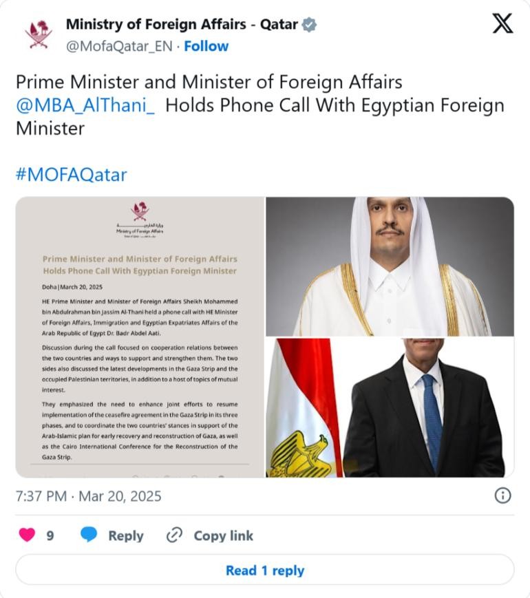 卡塔尔和埃及是以色列和哈马斯之间的主要调解人,他们表示需要加强努力,以实施加沙停火协议的三个阶段。