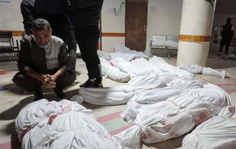 加沙城的阿赫利医院,一名妇女在辨认亲人尸体时悲痛不已。