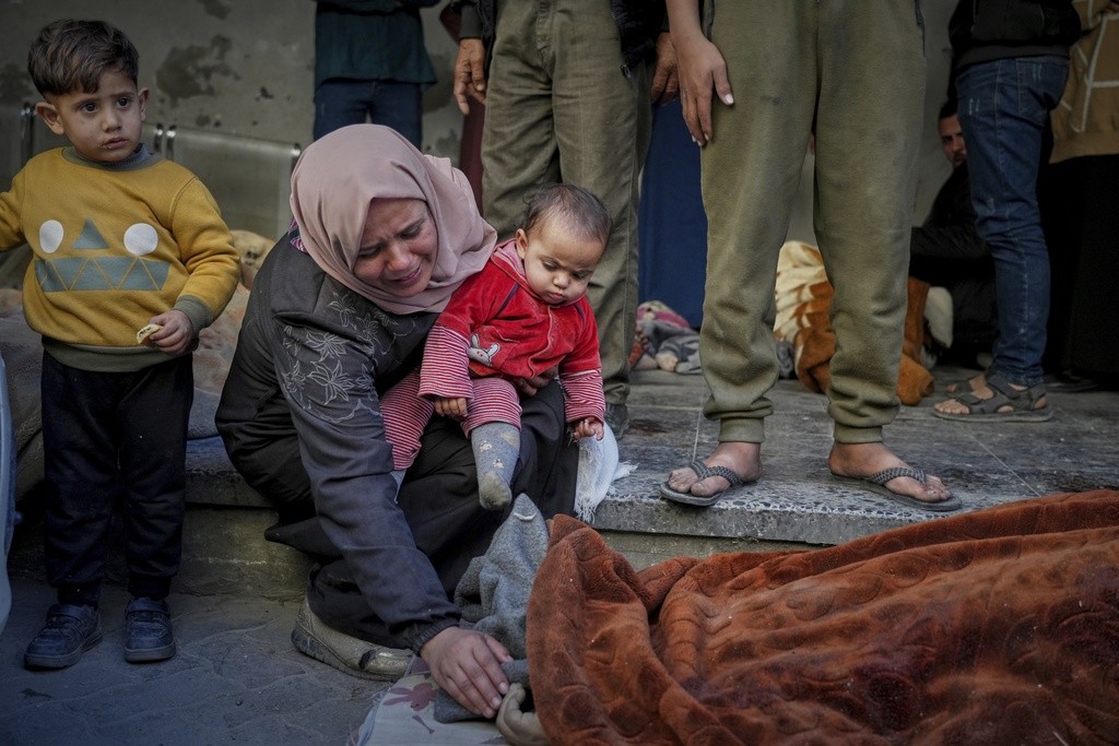 3月18日,加沙某个医院的太平间外,空袭遇难者的亲属悲痛万分。