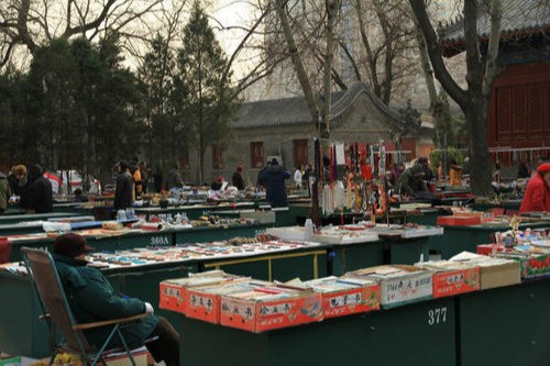 地摊紧密地排满报国寺中所有的空地,甚至蔓延到了寺门口和马路边。攒动的人头是这里每天的景色,每天都有各种各样的人来到这个地方,俯身打量着摊主面前的古物,上演着各种各样的故事。
