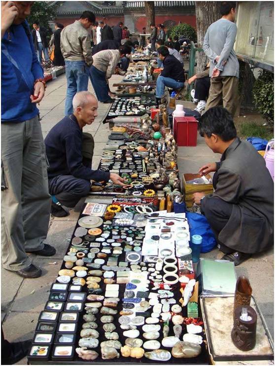 没有真学识,在地摊上是淘不到好东西的。外行在地摊上交学费的事不胜枚举。曾有一个人,在这里的地摊上看一个铜镜,结果不慎失手落地,这件酥脆而拙劣的仿品应声断裂,尽管周围的明眼人都明白,但此公还是按老货的价格赔偿了摊主。