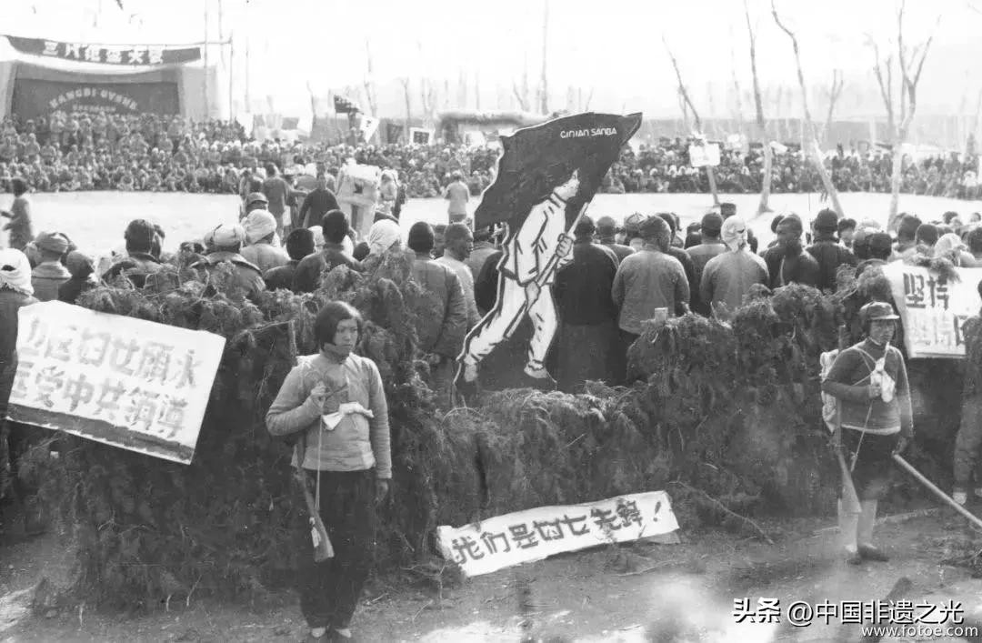 ▲1951年“三八”妇女节,广州市郊区的女民兵队伍。队伍上方的灯笼上写着“土地还家家家乐”,横幅上书“镇压反动地主”等口号。