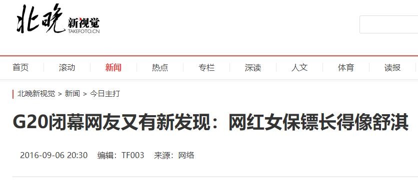 北晚在线2016-09-06发布的《G20闭幕网友又有新发现:网红女保镖长得像舒淇》