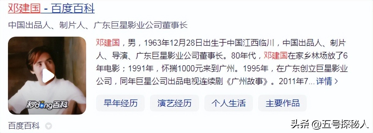 1997年初邓建国成立了广东巨星影业,并且在同年推出了《反贪风暴》《康熙微服私房记》等影视剧。