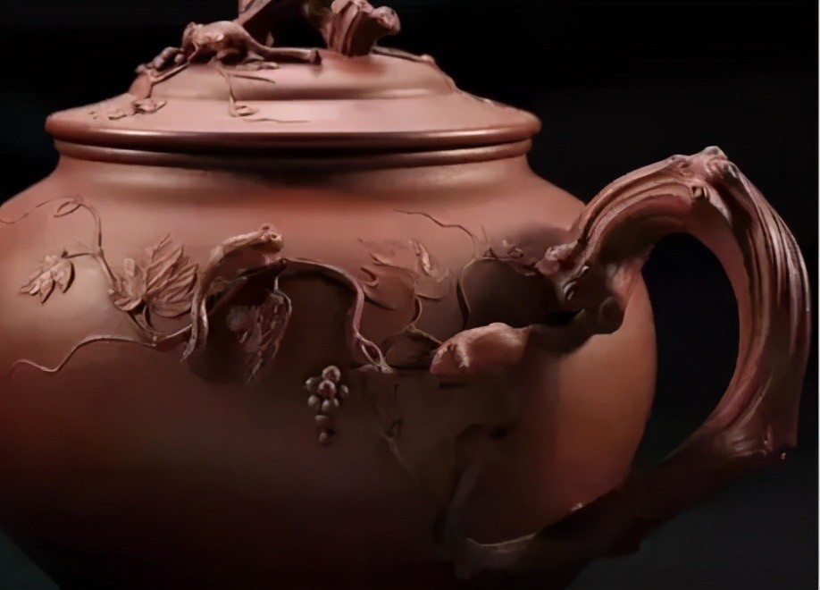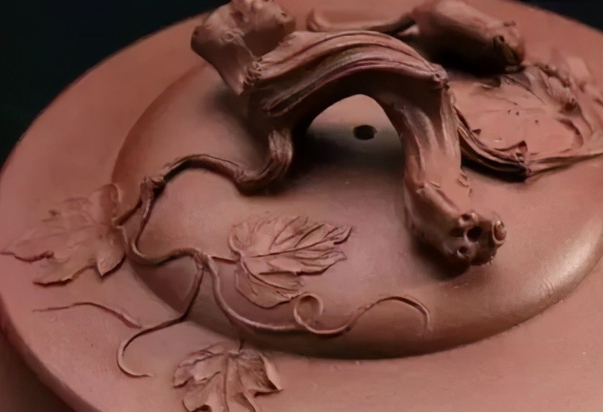 壶身塑缠绕葡萄藤及几只嬉戏的松鼠,并刻《阳羡砂壶图考》中称颂邵大亨“鱼化龙”壶的句子:“莹润如和玉,香雾纷腾茗初熟,七碗能生两腋风,一杯尽解炎与溽,壶兮壶兮出谁手,鬼斧神工原不朽。”壶把是三棵松树交错。