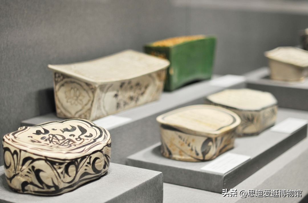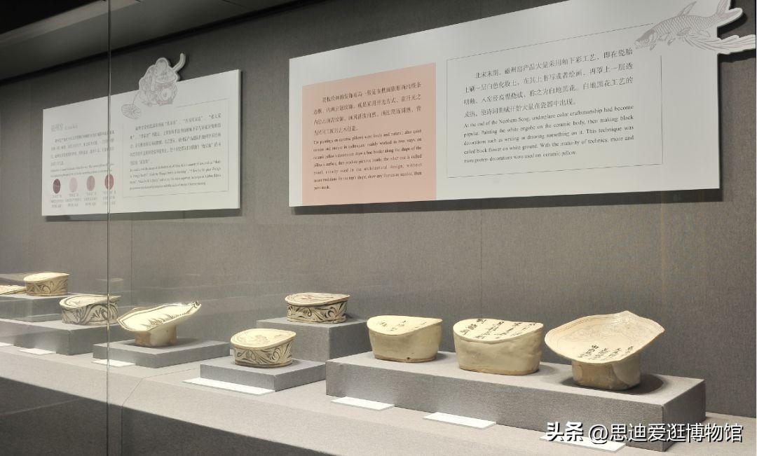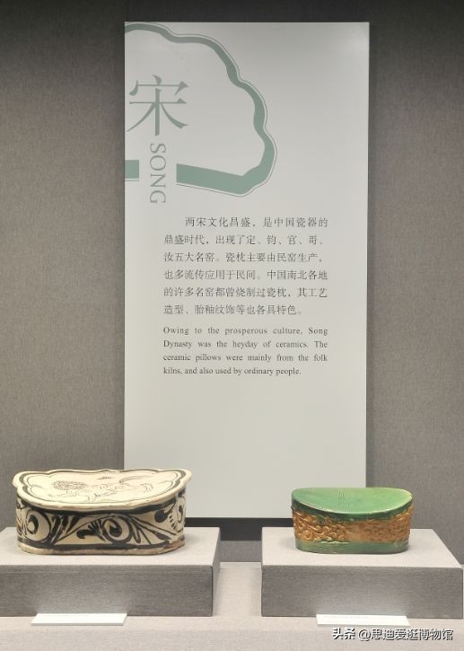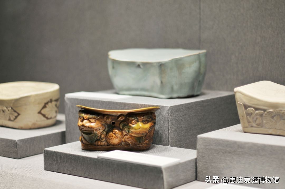 展览以年代为轴,分为六大部分。第一部分唐代,介绍巩县窑、长沙窑陶瓷枕,以及三彩、绞胎等相关技法,这些技法对后来的宋、辽三彩和元、明、清的珐花、素三彩、五彩瓷的影响深远;第二部分宋代,鼎盛期之陶瓷枕,定、汝、井陉、湖田等南北名窑都烧制瓷枕,白地黑花、印、划、剔、珍珠地等各式技法及其工艺造型各具特色;