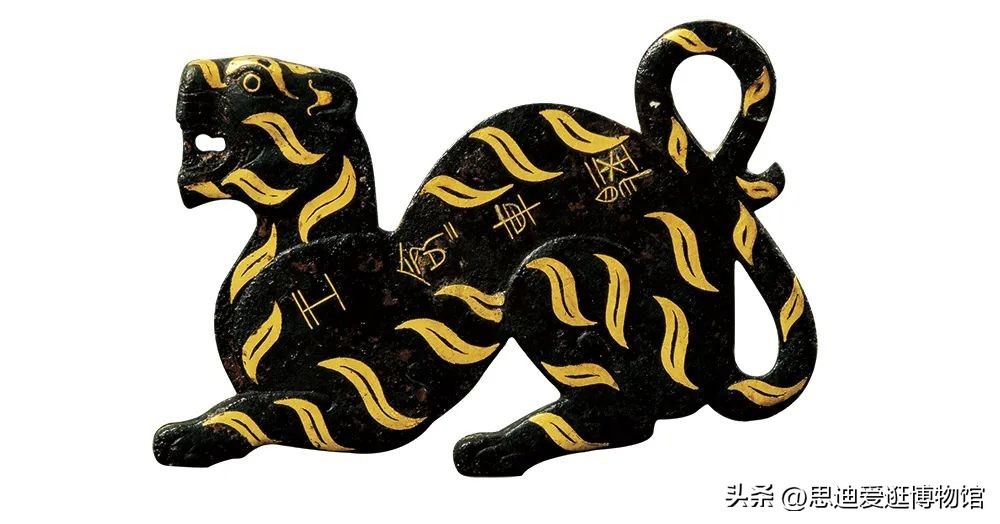虎节高11.6厘米,长19厘米,厚1.2厘米,造型别有韵味。整体来看,它就是一只昂首挺胸呈蹲踞姿势的黑色老虎,威风凛凛,尾巴卷曲成“8”字形,头、足、甚至是脸部的皱纹,都非常清晰。虎身上用弯曲的金箔片表现了色彩丰富的斑纹。这件铜虎节具有典型的楚文化特征。