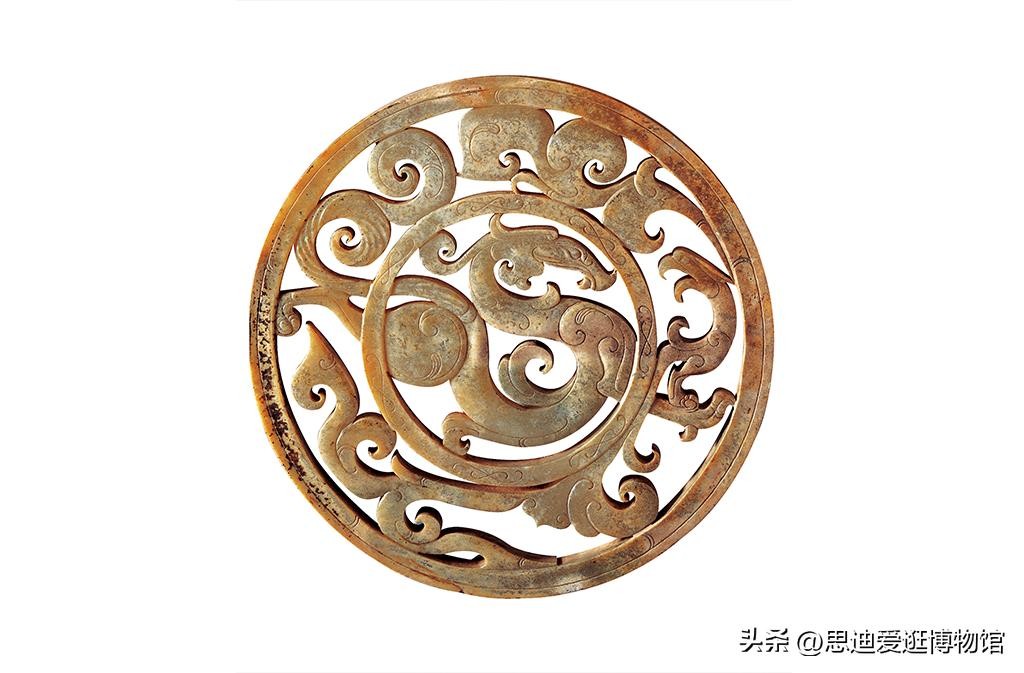 透雕龙凤纹重环玉佩直径10.6厘米,厚0.5厘米。是一件装饰玉器,堪称国宝。它出土于墓主右眼位置,青白玉雕成,土沁呈黄白色。在设计上,玉佩分为内外两圈,内圈透雕一条游龙,外圈透雕一只凤鸟,站在龙的前爪之上。 龙尾和后爪伸向外圈,凤冠和尾羽上下延成卷云纹,把外圈空间填满。凤鸟回眸凝望游龙,龙凤似喃喃细语,妙韵天成。龙凤相对,寓意吉祥。这件玉佩雕镂精细,构图完美和谐,主次分明,是汉代玉器中不可多得的艺术珍品。