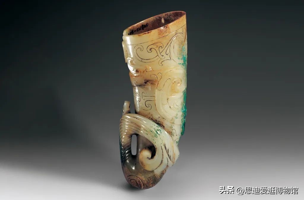 杯形似犀角,杯身雕刻一尖嘴夔龙,龙头为浅浮雕,龙身逐渐凸起为高浮雕,杯底为圆雕,多种雕刻技法于一身,堪称汉玉之绝品。