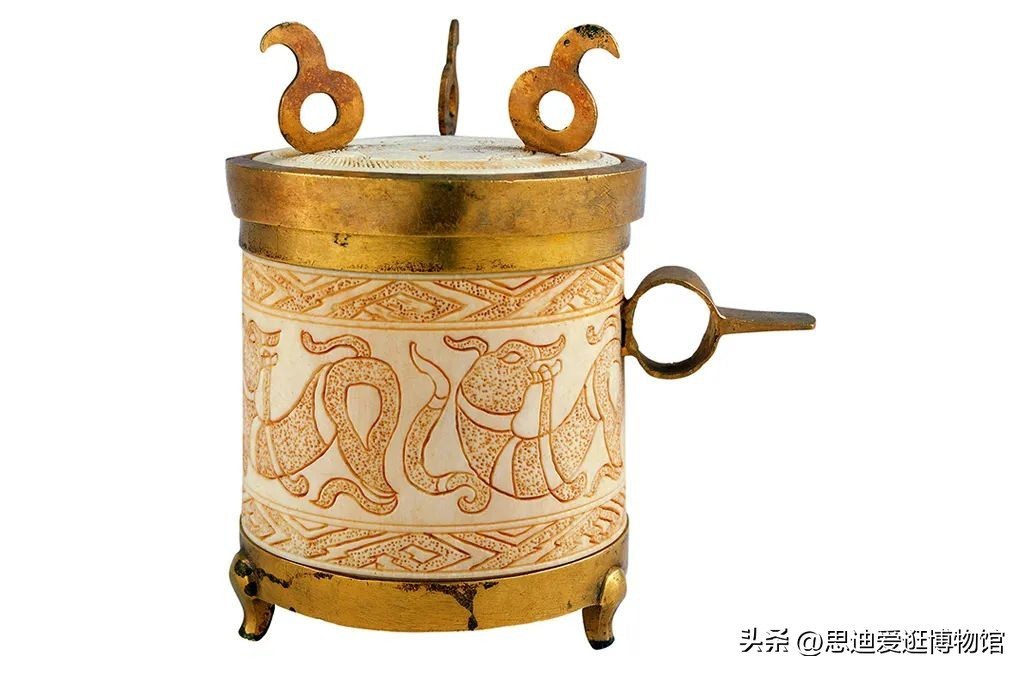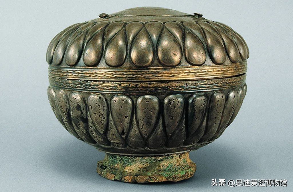 这个呈扁球形的银盒,出土于南越王棺椁的“足箱”内。银盒盖和盒身有凸纹,使用“锤揲法”制作,即用模子压着捶打而成。这种工艺、纹饰和造型是古代西亚波斯一带银器的特点,而与中国本土的不同,因此有学者认为这是一件舶来品。银盒进入中国后,工匠根据本土器物的特点,在盖上焊接了盖钮(可能用于套装钮座),在盒底加了圈足,还在器身上留下铭文。出土时,银盒内还有药丸半盒。