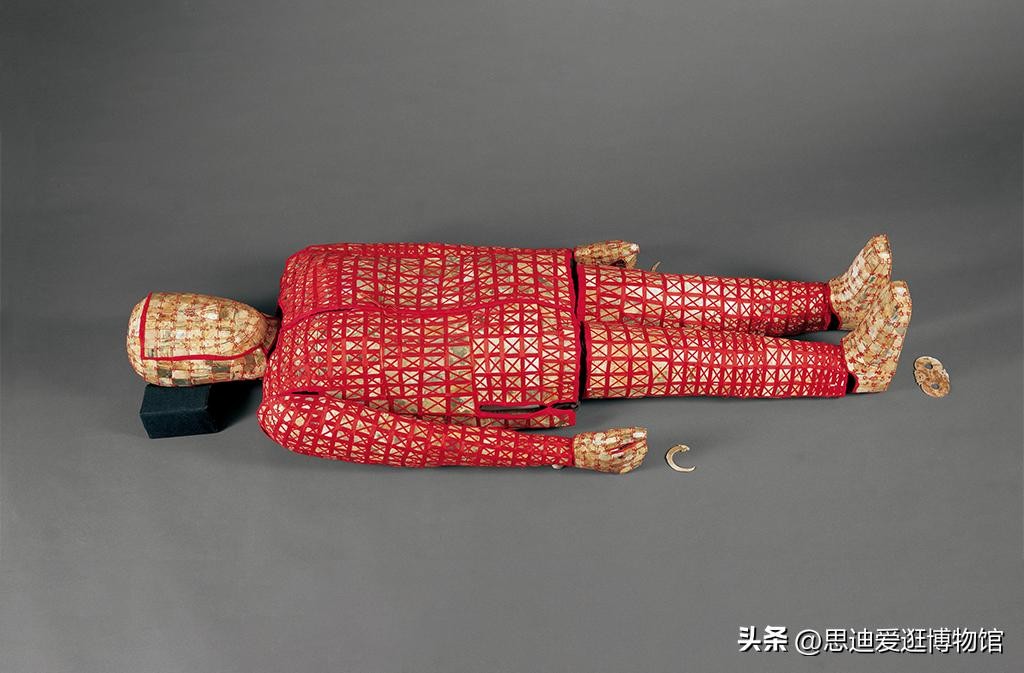 在丝缕玉衣的上半身,覆盖着一件短上衣,叫珠襦。所谓珠襦,就是用小珠缀串装饰的短上衣。南越王珠襦下部装饰三条纹带,由金花泡、金素泡、银贝、玻璃贝等组合成菱形图案,缝缀在衬里的丝绢织物上。