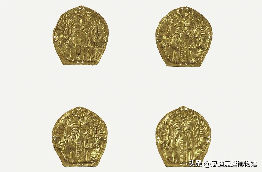古代死人入殓时,面部覆盖的物品称“覆面”。赵眜玉衣面罩上盖有绢帛覆面,绢帛已朽,仅存其上的8件羊头纹金饰片。