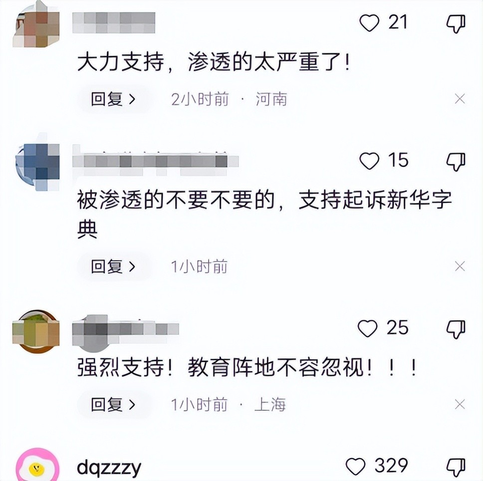 一经曝光,网友纷纷表达对起诉《新华字典》的支持,认为这是文化入侵的体现。有网友表示,“教育阵地不容忽视”,对于家长来说,这是一个时刻保持警惕的时候。毋庸置疑,对于下一代的教育,我们绝不能掉以轻心。