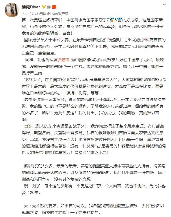 对于这样的事情,杨健也是回应的奥运会,他首先向自己的队友曹缘道歉,请求曹缘原谅自己,当时自己输了之后,如同一具行尸走肉一般,脑子全是空白!