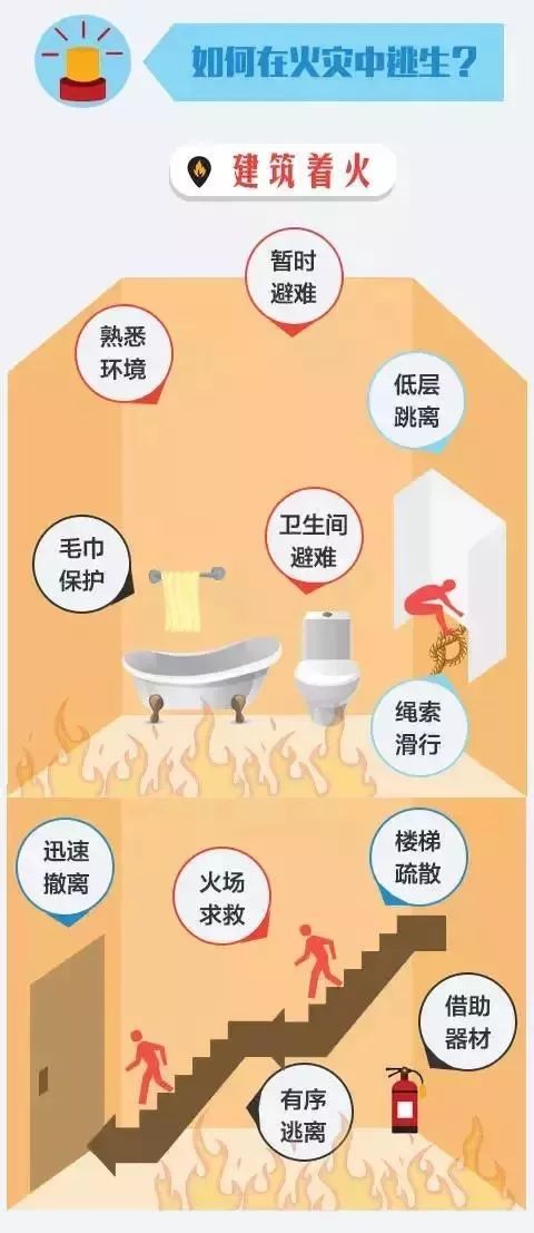 当发生火灾时,业主要主动组织人员进行自救和疏散。其余人员不要惊慌,要及时拨打“119”电话报警,并迅速寻找正确的逃生通道进行逃生。处于低楼层的人们可以利用水管或床单进行逃生,千万不要贪恋财物,不可乘坐电梯,不可盲目跳楼,尤其是3层以上的建筑,盲目跳楼有生命危险。若是逃生通道已被火势封堵无法逃生时,要选择退到上风方向的阳台或天台等待救援。