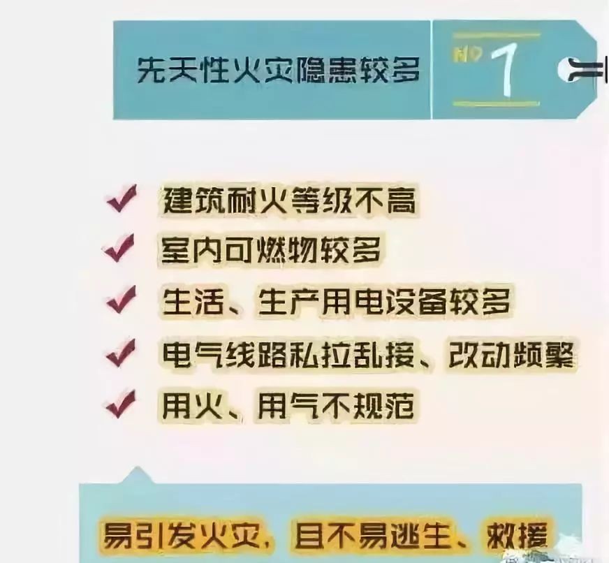 家庭小作坊多为居民私自搭建,以家庭为单位的简陋生产加工区,通常存在生产、住宿、仓储为一体的“三合一”现象,且该类场所用火用电量大,并堆积存放大量易燃货物,消防安全条件较差,人员消防安全意识淡薄,安全隐患极为突出。
