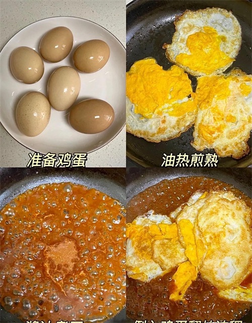 3. 加入生抽和一点水,最后把刚刚煎好的荷包蛋放进去,轻轻翻倒,让每个蛋都沾上糖醋汁。