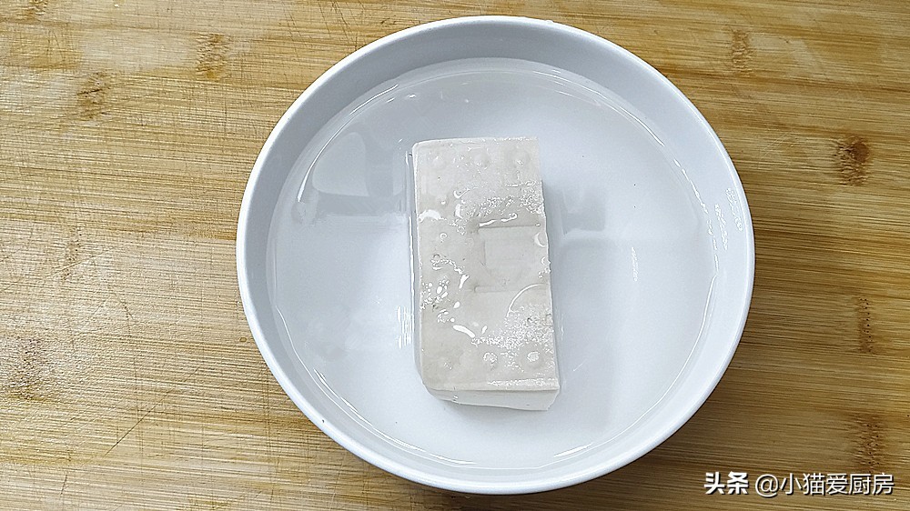 【步骤三】:把豆腐放碗中,放一勺盐,同时添水泡上,把豆腐的豆腥味去除。