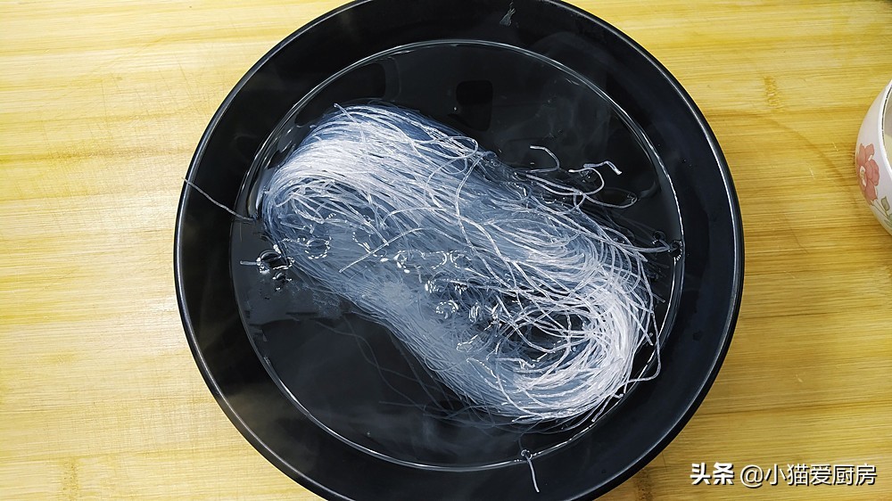 【步骤二】:把粉丝放大碗中,倒入温水,把粉丝泡软。