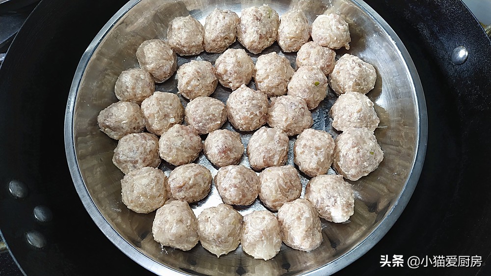 【步骤九】:锅中添水,放入盖帘,再放入铁盘,在盘子中刷一层油,然后把和好的调料馅全部用手团成丸子,放盘子中,盖盖大火烧开,转中火蒸5分钟左右,放凉备用。