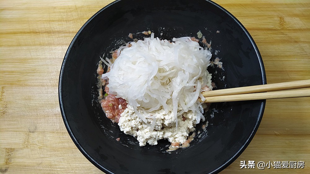 【步骤八】:然后用筷子充分的把肉馅、萝卜丝、鸡蛋、豆腐充分的搅拌均匀,搅上劲备用。