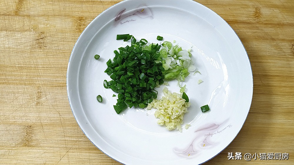 【步骤四】:把生姜切成姜末,大蒜拍碎剁成蒜末,把香葱切成葱末,葱白和葱叶分开;然后装盘备用。