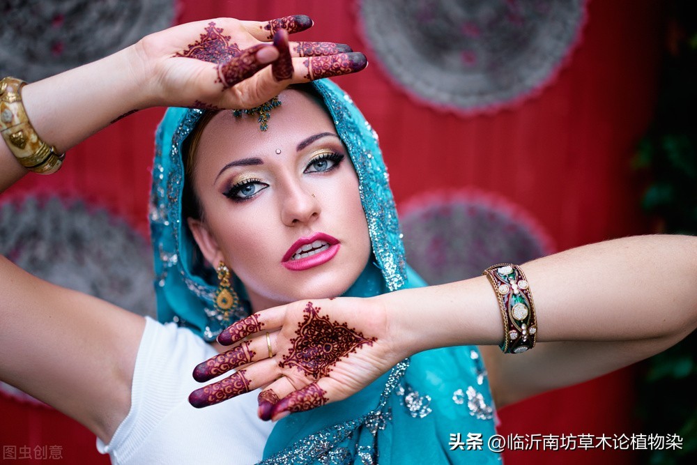 而关于海娜,其主要源于西亚,南亚,北非等热带区域一种叫做henna的植物,在我国也有一种叫做凤仙花的植物与其类似,都能提取出棕红色的植物染料,由于最早人们主要将这类植物用于染指甲,因此也常常被人称之为指甲花。关于海娜的历史则最早可以追溯到公元前16世纪的埃及,而如今,海娜已经成为北非,东南亚等地区最流行的染料之一,尤其是印度,有着世界最为适宜海娜生长的环境和最先进的海娜种植加工技术,因此海娜也成为了印度的象征,他们会在所有的重要节日场合使用海娜进行人体彩绘,以至于我们可以在所有有关印度元素的电影中都能看到这种植物。