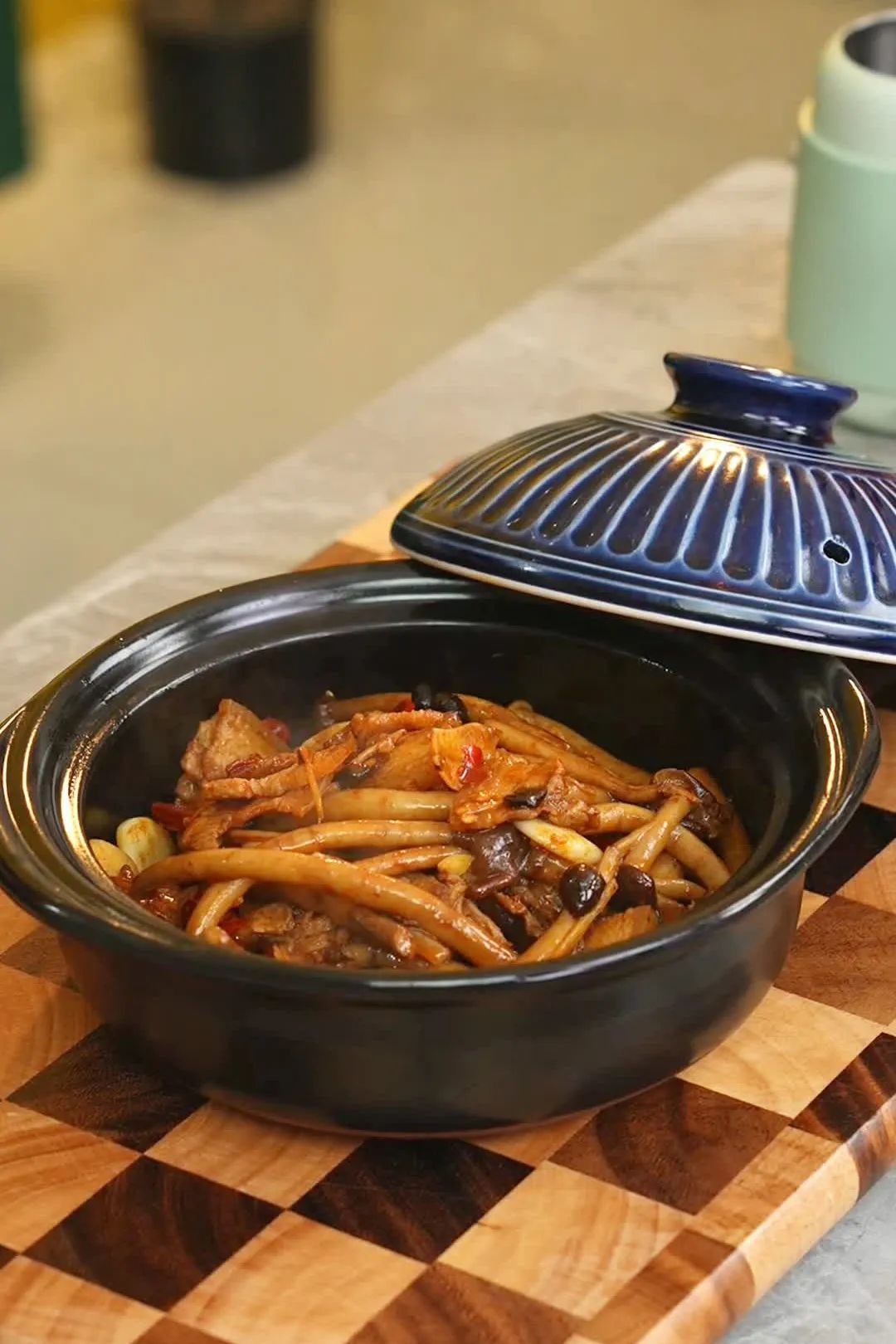 **这道菜炒完就可以直接装盘了,但如果赶上家里请客吃饭,一顿饭吃得时间比较长,我们可以找一个小砂煲,把它加热一下,再把炒好的茶树菇装在里面,这样它全程都是温热的状态,非常好吃,也很香!