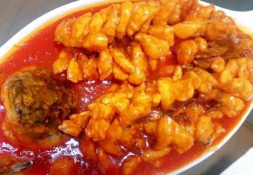 (7)锅底留油,加入2勺番茄酱,煸炒出红油,再倒入调好的料汁,煮至汤汁浓稠。