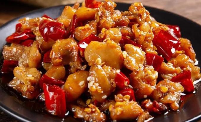 (1)鸡胸肉洗净切丁,干辣椒切段,小葱剥皮切葱花,蒜瓣剥皮切末,干辣椒切段。