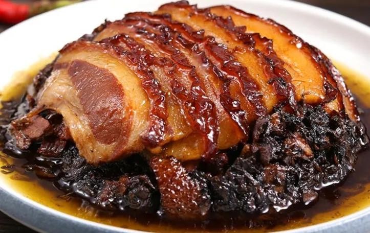 (6)盘中底部放入一层梅干菜,上面均匀地铺一层五花肉片,再淋入调好的料汁。
