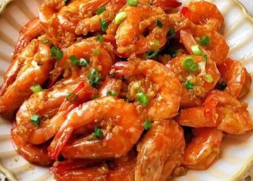 (6)再倒入调好的料汁,至汤汁浓稠,下入基围虾,翻拌均匀,收汁关火出锅。