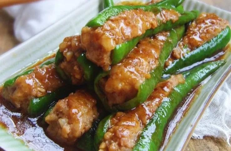 (4)取适量调好的肉馅,依次塞入辣椒里面,起锅烧油,待油温七八成热,下入辣椒酿肉,煎至肉馅定型,表面变色,盛出。