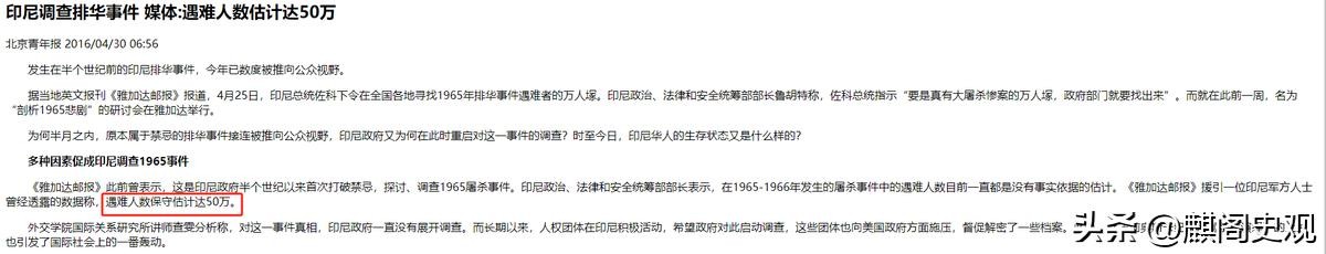 近几年,英国《卫报》根据国家档案馆数据,公布了1965年印尼排华事件的死亡人数,至少有50万人丧生,这是20世纪最严重的大屠杀之一。
