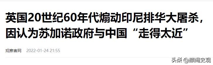 观察者网2022-01-24《英国20世纪60年代煽动印尼排华大屠杀,因认为苏加诺政府与中国“走得太近”》