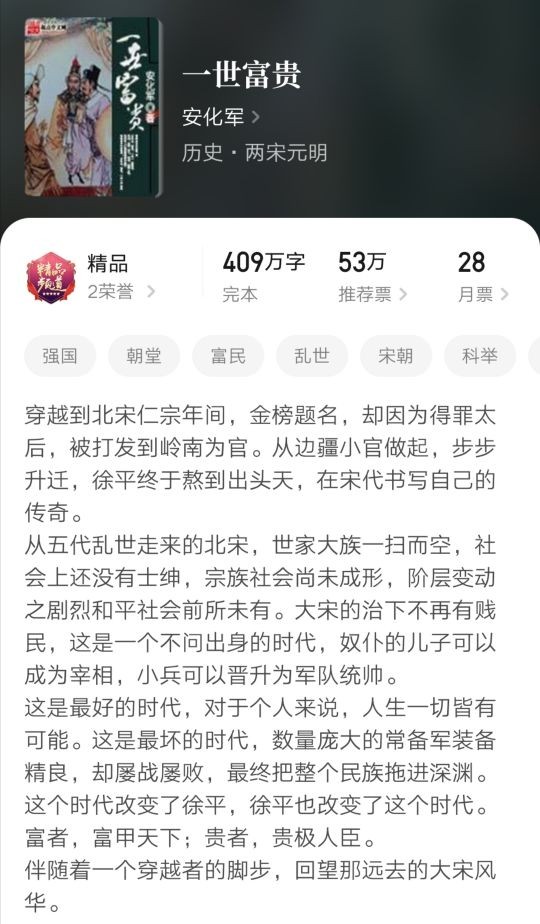 穿越到北宋仁宗年间,金榜题名,却因为得罪太后,被打发到岭南为官。从边疆小官做起,步步升迁,终于熬到出头,在宋代书写自己的传奇。这是一篇历史种田文,没有到处打脸的情节,也没有争霸成为皇帝,而且默默努力,改变这个时代,从经济入手,使得国家更加富强,里面包含了很多作者自己的见解,需要耐心读,才能看进入。这一本是一位读者朋友推荐的,我以前并不知道此书,但确实写的不错。可见有的小说写的很好,却名气不大,而被很多书友遗漏了。