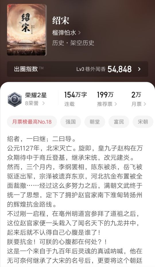 在适应身份后,逐步展开图强之策,后面的战争场面非常精彩宏大,几千字的大章看得读者直呼过瘾,《绍宋》也是榴弹怕水继《覆汉》之后又一次掀起历史架空小说高潮的作品,即使没有完结也值得一读,是喜爱历史类小说书友不可错过的佳作。