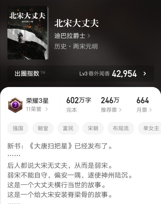这本是迪巴拉爵士的小说,此次男主没有金手指,靠的全是自身的本事,没有深厚的历史知识底蕴是无法完成的,故事从主角背着妹妹在开封夜市谋生开始,凭借着聪慧的头脑和对历史大方向的把控,在大宋搏出一片天地。此书完结于今年五月末,同样作者新书《大唐扫把星》也已经发布。