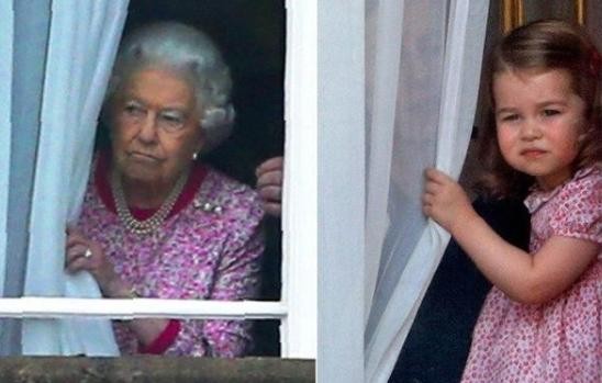 现在已经95岁的伊丽莎白女王,脸颊依旧是肉肉的。在行为上,夏洛特公主和女王还是有很相似的地方,就比如扒窗帘的时候。