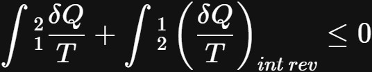 为了证明熵增原理,我们将考虑一个包含两个过程的循环。第一个过程,过程1-2,是可逆的还是不可逆的。接下来,第二个过程,过程2-1是内部可逆的。考虑克劳修斯不等式,推导出下列方程。