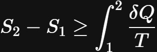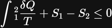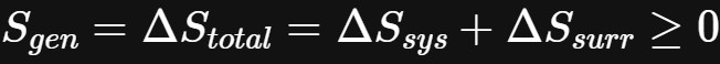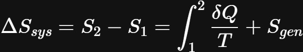 对于上述情况,内部可逆过程发生相等。另一方面,这个不等式发生在不可逆过程中。因此,对于不可逆过程,封闭系统的熵变总是大于δQ/T。相反,在可逆过程的有限情况下,两个量相等。最后,在一个过程中产生的熵被称为熵生成。熵的生成用变量$S_{gen}$表示。反过来,方程2可以改写为: