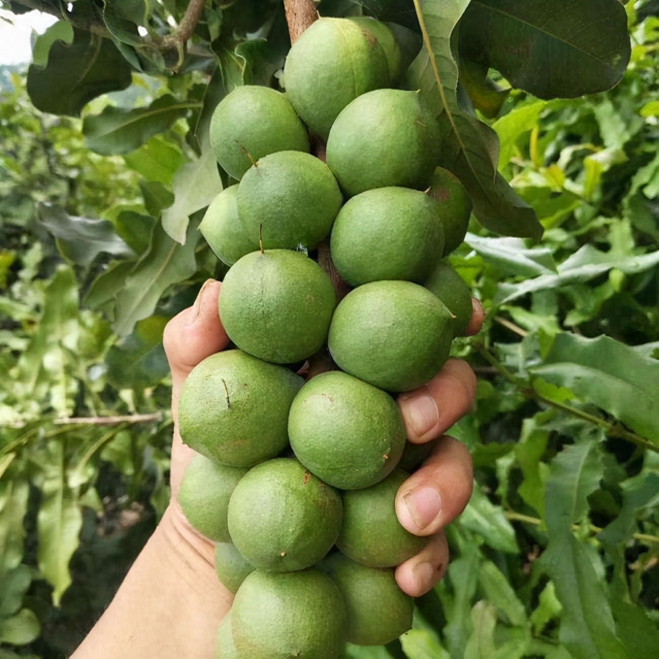 夏威夷果又叫澳洲坚果,别名昆士兰栗、澳洲胡桃、昆士兰果等。是一种原产于澳洲的树生坚果。是澳洲坚果属常绿乔木,双子叶植物。树冠高大,叶3~4片轮生,披针形、革质,光滑,边缘有刺状锯齿。总状花序腋生,花米黄色,果圆球形,果皮革质,内果皮坚硬,种仁米黄色至浅棕色。适合生长在温和、湿润、风力小的地区。