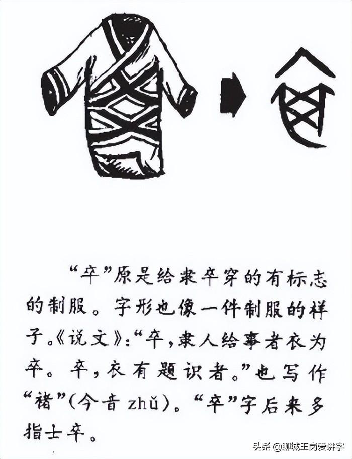 “卒”有两个读音 zú和cù。 看下图“卒”的甲骨文像一件密密麻麻缝好线的衣服,表示衣服已经缝制完成。在小篆字形中,又在“衣”上加几点点标记,表示穿这种衣服的人,假借为古代供仆役;仆人穿的一种衣服,特指服役士兵,古时多指步兵。如:象棋中就用5个小卒子,表示五位士兵。古装剧中士兵的衣服背面也有个“卒”字当做标记,以区别于常人。