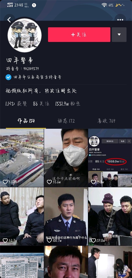 并且他非常积极的配合四平公安的工作,和四平公安一起拍普法的段子,用诙谐幽默的方式带大家学会法律,告诉大家怎么样保护自己。他们共同合作的抖音号——四平警事,粉丝数目已经达到1551.9w,并且四平市的警局已经陆陆续续的得到省内很多奖,这更加证明四平市的普法做的非常到位!